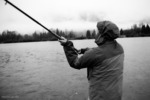 Big Cowboy! Rodger Pope with a nice hen. Below caster in black and white on the Skeena. |
